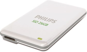 Dit is een hele grote USB-stick met het uiterlijk en de aansluiting van een harde schijf. Hij heeft geen bewegende delen, kan tegen een stootje en is supersnel.
